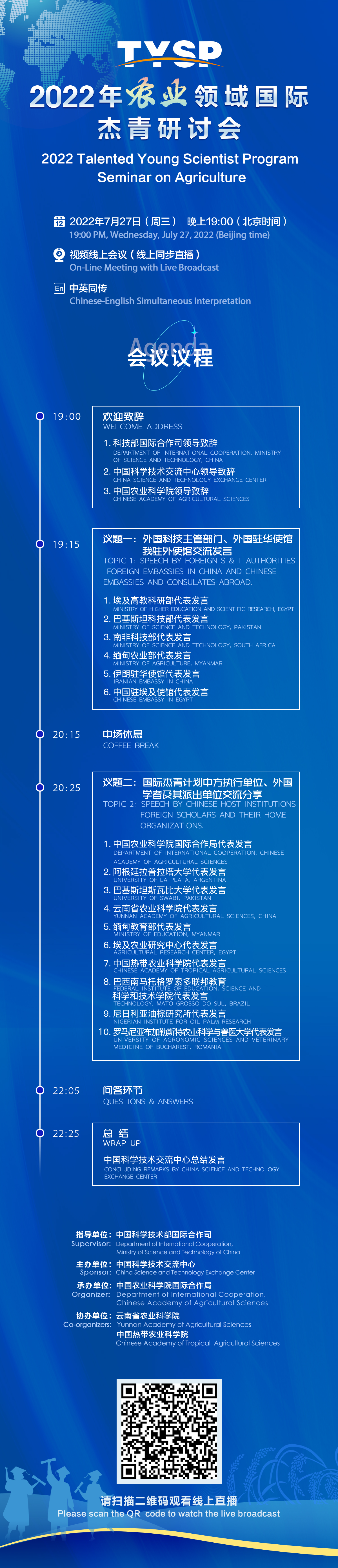 To promote people-to-people exchanges in the sci-tech field among the Belt and Road countries, and build a platform for mutual learning between Chinese and foreign agricultural experts,?2022?Talented?Young?Scientist?Program?Seminar?on?Agriculture?will be held in a hybrid format at 19:00 (Beijing Time) on July 27, 2022.