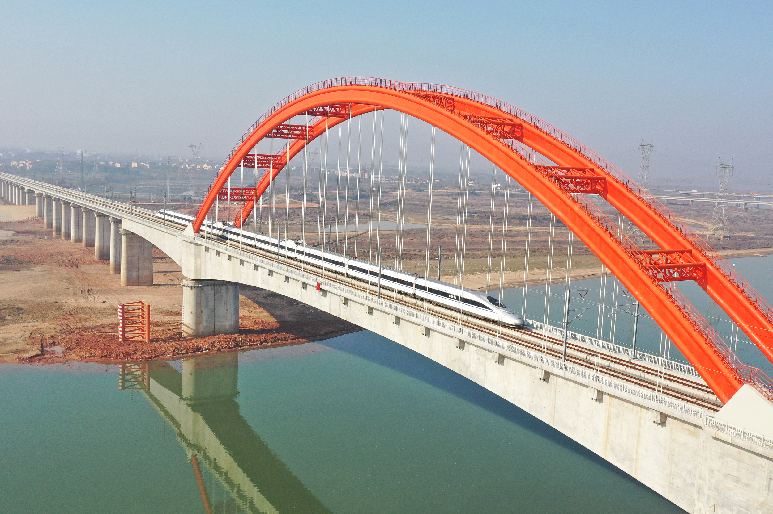 early 90 percent of the Huangshan-Nanchang section is elevated above lakes, plains, and hills. It passes through Poyang Lake, a habitat for Yangtze finless porpoises, Junshan Lake, a pollution-free aquatic products breeding base, and Jinxi Lake, a habitat of white swans. Protecting the beautiful ecological environment along the line has become an important task in the construction of the railway.
