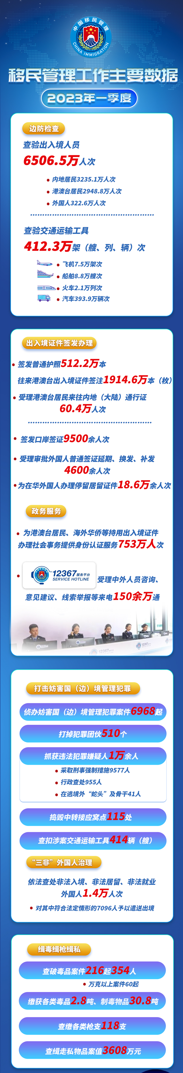 一季度查验交通运输工具412.3万架(艘、列、辆)次,其中飞机7.5万架次,船舶8.8万艘次,火车2.1万列次,汽车393.9万辆次;签发普通护照512.2万本、往来港澳台出入境证件签注1914.6万本(枚),受理港澳台居民来往内地(大陆)通行证60.4万人次;为港澳台居民、海外华侨等持用出入境证件办理社会事务提供身份认证服务753万人次,12367服务平台受理中外人员咨询、意见建议、线索举报等来电150余万通。