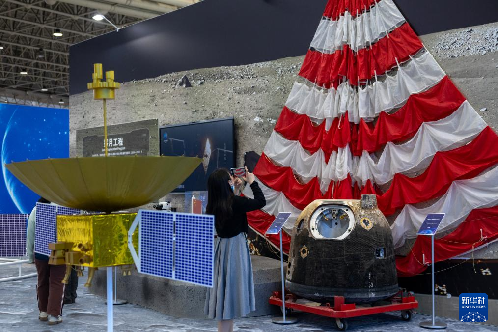 4月23日,参观者在科普展区拍摄嫦娥五号返回舱用主降落伞等实物展品。新华社记者 胡竞文 摄
