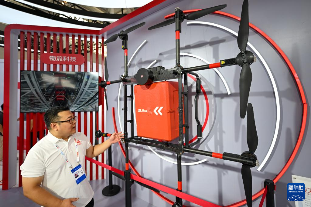 6月20日,参展商在博览会现场介绍一款专业物流配送无人机。新华社记者 孙凡越 摄