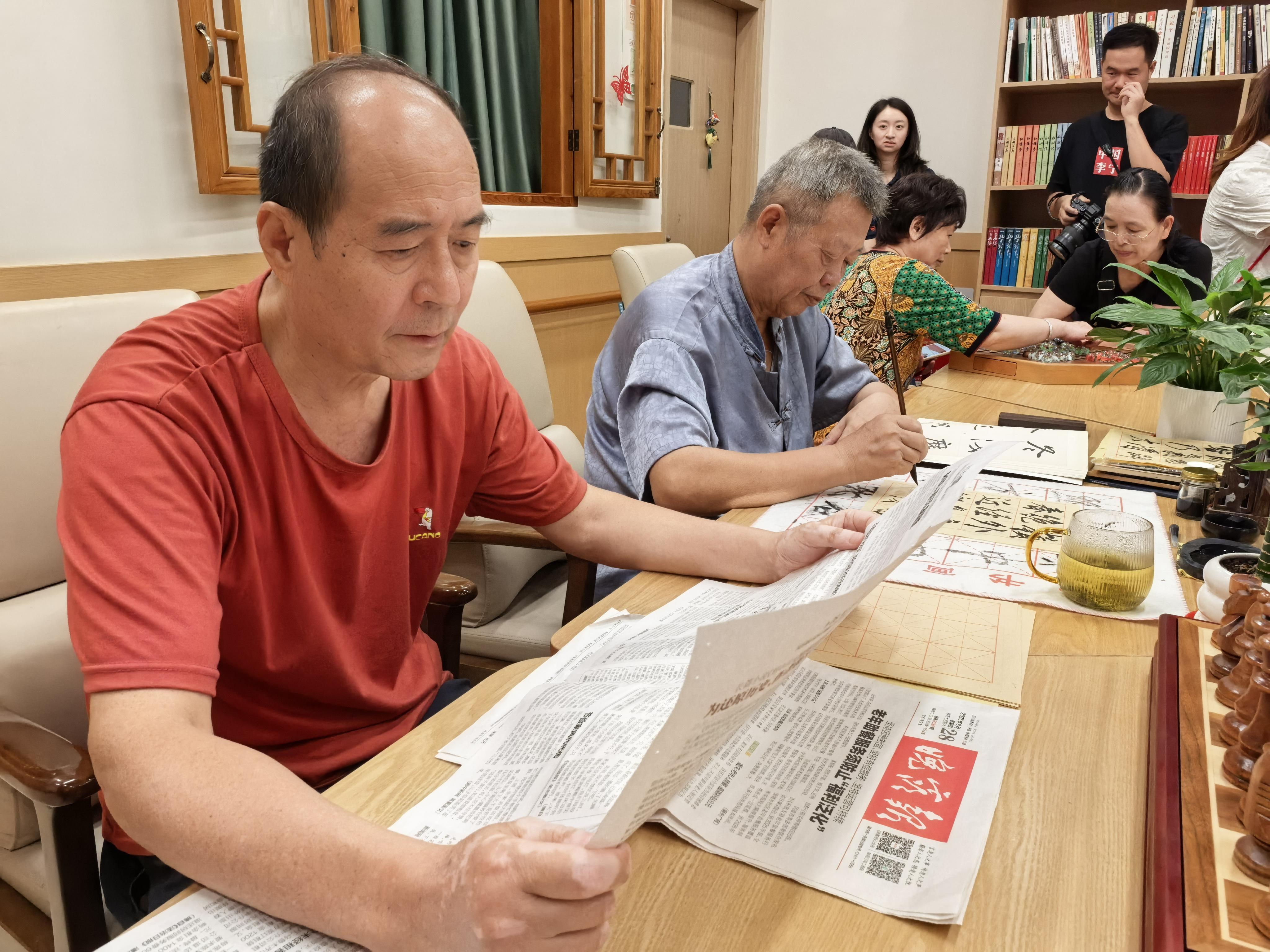 记者看到,日托室内,护工们正仔细照料老人;活动中心里,老人们或读报或练习书法,悠闲安逸;一旁的银龄医馆里,前来问诊的社区老人正和坐诊医生交谈;图书角里摆放承载着老人回忆的文学名著、连环画和小人书……