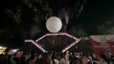 在湖南省张家界天门山景区,国庆假期期间,这里每晚都会上演一场山水民俗视觉盛宴,令现场观众赞不绝口。