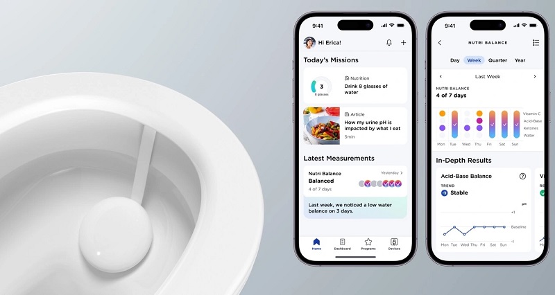 Withings表示,尿液中含有3000多种代谢物,可以立即反映人体的平衡和健康状况。而该装置可以通过检测黄体生成素和pH值水平来跟踪女性每月的荷尔蒙变化,并将检测结果同步到手机App上。这些测量结果的结合可以帮助人们监测身体代谢,以优化他们的日常水分和营养摄入量。它还可以为用户推荐锻炼计划,提供饮食建议。