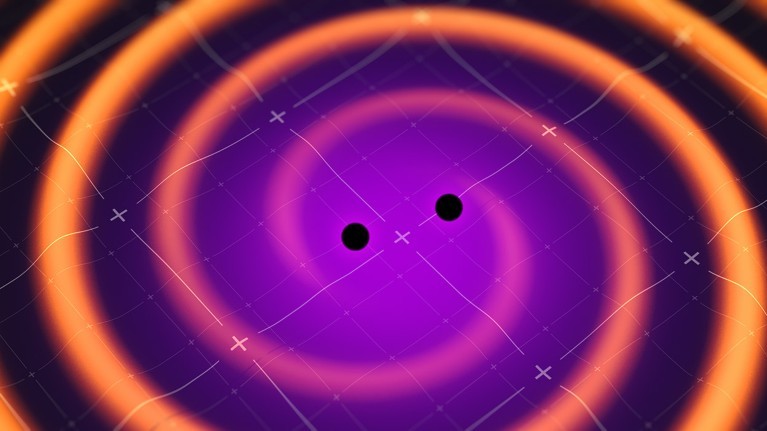 两个“共舞”黑洞产生的引力波的频率越来越高。图片来源:美国国家航空航天局