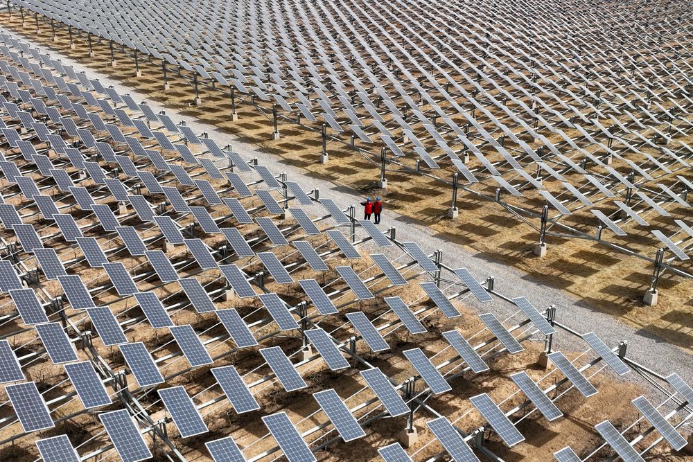 在无垠的沙漠,或在浩渺的湖面,或在连绵的山峦,从高空俯瞰,一块块光伏板横竖排布形成方阵,如同一片蓝色海洋,在阳光下熠熠生辉,蔚为壮观。